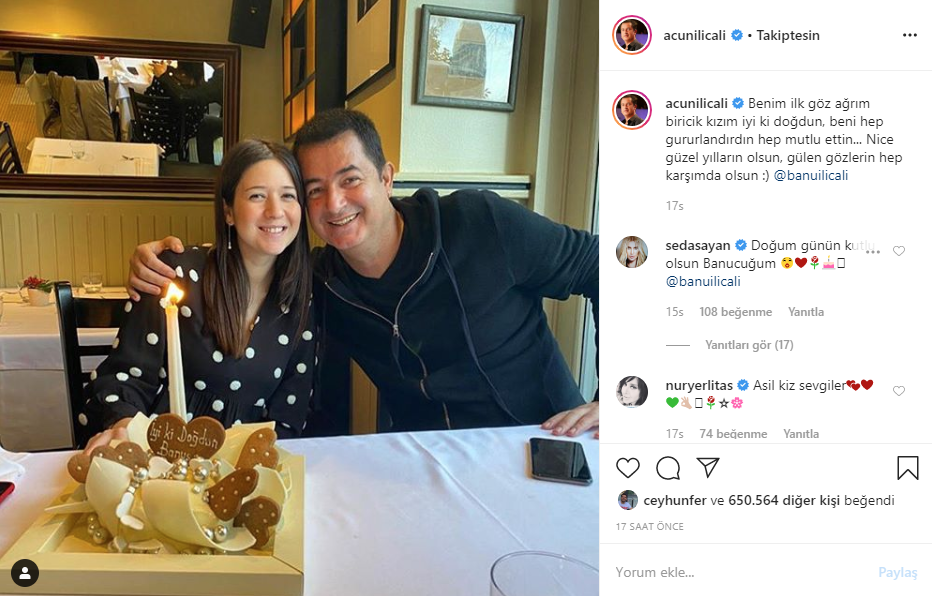 Ünlü televizyoncu Acun Ilıcalı, kızı Banu Ilıcalı’nın yeni yaşını sosyal medya hesabından kutladı.