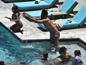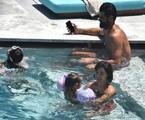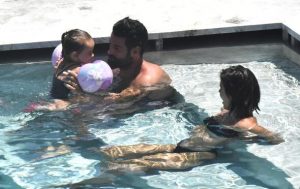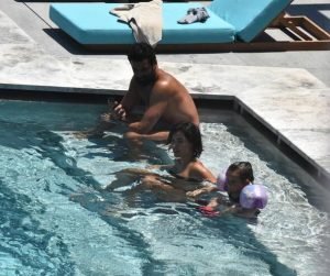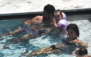 Bir süre şezlongda dinlenen çift, ardından kızlarıyla birlikte havuzda oyun oynarken objektife yansıdı.