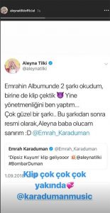 Aleyna Tilki bu gelişmeyi sosyal medya hesabından,” Emrah’ın albümünde 2 şarkı okudum. Birine de klip çektik.Yine yönetmenliğini ben yaptım.Çok güzel bir şarkı. Bu şarkıdan sonra, resmi olarak ‘Aleyna baba’ olacağım sanırım” notunu düştü.
