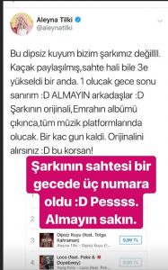 Aleyna Tilki’nin ‘Dipsiz Kuyum’undan remiks yapılarak hazırlanan ‘Dipsiz Kuyu’ adlı sahte şarkı dün gece i Tunes listelerinde 3’üncü sıraya kadar yükseldi.