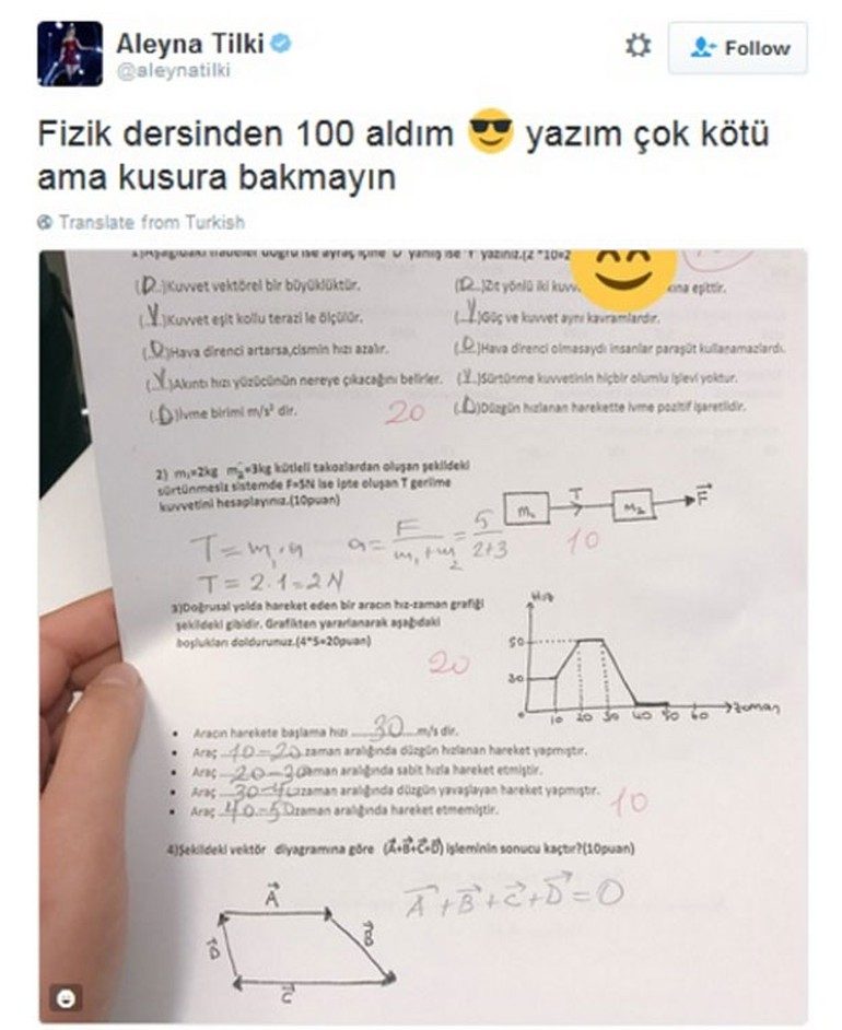 Katıldığı etkinliklerde de sürekli olarak eğitim hayatına ağırlık verdiğini söyleyen Aleyna Tilki şimdi de sınava kağıdının fotoğrafını sosyal medya hesabından paylaştı. Sınav kağıdını Twitter sayfasında yayınlayan Tilki, altına ‘Fizik dersinden 100 aldım, yazım kötü kusura bakmayın” notunu düştü.
