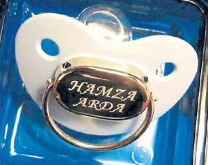 Arda Turan-Aslıhan Doğan çiftinin kasım ayında doğacak bebeğine hediye yağıyor. Bunlardan biri de yıldız futbolcunun teyzesinin aldığı altın emzik.
