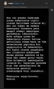 Hadise, “Son iki gündür hakkımda çıkan haberlerle ilgili olarak belirtmek isterim ki; her iki haber de sadece kamuoyunu lüzumsuz yere meşgul etmeyi amaçlayan gerçek dışı iddialardır.