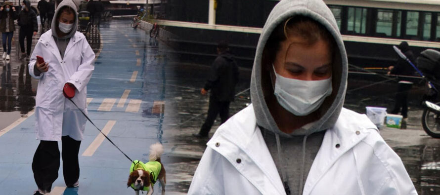 Aslı Turanlı, kapüşonu ve maskesine rağmen kendisini tanıyıp fotoğrafını çeken muhabirleri tebrik etti: “Helal olsun valla, nasıl tanıdınız!” Sağlık çalışanlarının önlüklerini anımsatan beyaz yağmurluğuyla dikkat çeken Turanlı, köpeği Charlie ile yağmur altındaki yürüyüşüne devam etti.