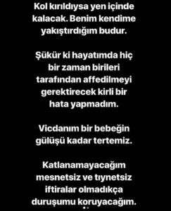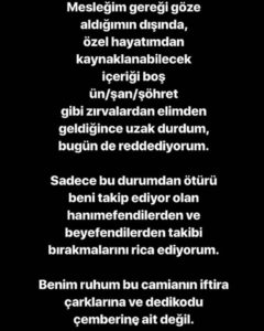 Mesleğim gereği göze aldığımın dışında, özel hayatımdan kaynaklanabilecek içeriği boş ün/şan/şöhret gibi zırvalardan elimden geldiğince uzak durdum, bugün de reddediyorum. Sadece bu durumdan ötürü beni takip ediyor olan hanımefendilerden ve beyefendilerden takibi bırakmalarını rica ediyorum.Benim ruhum bu camianın iftira çarklarına ve dedikodu çemberine ait değil.”