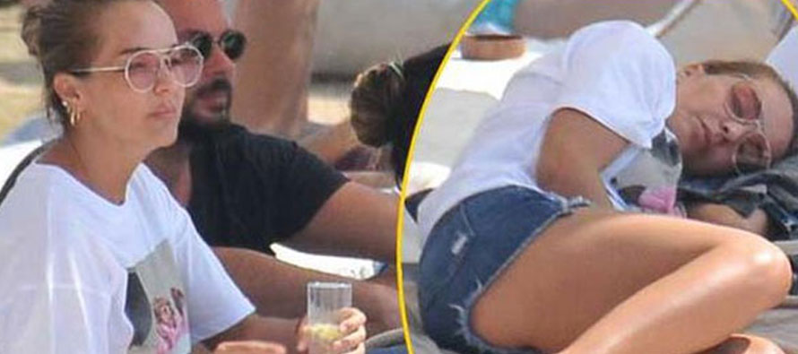 Alaçatı Solto Otel’de havuz başında otururken görüntülenen aşıklar gün boyu gölgede şemsiye altında kalmayı tercih etti.