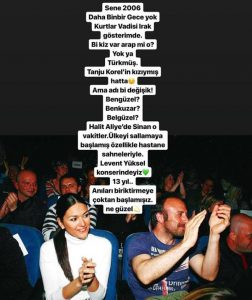 “Sene 2006. Daha ‘Binbir Gece’ yok. ‘Kurtlar Vadisi Irak’ gösterimde. Bir kız var Arap mı o? Yok ya Türkmüş. Tanju Korel’in kızıymış hatta. Ama adı bir değişik. Bengüzel? Benkuzar? Belgüzel? Halit, ‘Aliye’de Sinan o vakitler. Ülkeyi sallamaya başlamış özellikle hastane sahneleriyle. Levent Yüksel konserindeyiz. 13 yıl… Anıları biriktirmeye çok başlamışız. Ne güzel” ifadelerini kullandı.