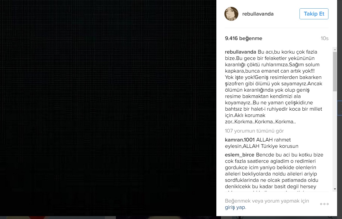 Ünlü oyuncu, instagram hesabı üzerinden, "Bu acı, bu korku çok fazla bize. Bu gece bir felaketler yekününün karanlığı çöktü ruhlarımıza. Sağım solum kapkara, bunca emanet can artık yok! Yok işte yok! Geniş resimlerden bakarken şizofren gibi ölümü yok sayamayız. Ancak ölümün karanlığında yok olup geniş resime bakmaktan kendimizi ala koyamayız. Bu ne yaman çelişkidir, ne bahtsız bir halet-i ruhiyedir koca bir millet için. Aklı korumak zor. Korkma. Korkma. Korkma" ihadelerini kullandı.