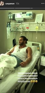 Soğuk algınlığı nedeniyle hastanelik olan Can Yaman fotoğrafa “Yazıyorsunuz böyle fıskiyeli sahneleri sonra hastanelere düşüyoruz” notunu düştü.