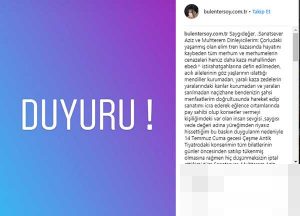 Bülent Ersoy Türkiye’yi yasa boğan tren kazasında, hayatını kaybedenlere saygısından ötürü 14 Temmuz’da vereceği konseri iptal ettiğini sosyal medya hesabından duyurdu.