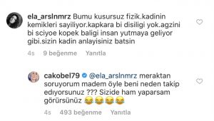 Çağla Şıkel’in Bodrum’daki görüntülerine bir takipçisi, “Bu mu kusursuz fizik? Kadının kemikleri sayılıyor. Kapkara bir dişiliği yok. Ağzını bir açıyor köpek balığı insan yutmaya geliyor gibi. Sizin kadın anlayışınız batsın” yorumunu yaptı. Manken ve sunucu Şıkel, takipçisinin yorumuna sessiz kalmadı. Çağla Şıkel, “Meraktan soruyorum, madem öyle beni neden takip ediyorsunuz? Sizi de ham yaparsam görürsünüz” diyerek şakayla karışık ayar verdi.