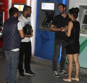 Genç çift, mekandan çıkışta para çekmek için yakında bulunan ATM’ye yöneldi.Ancak çevreleri bir anda sokak çalgıcıları tarafından sarıldı. Para isteyen çalgıcılardan kurtulmak için yoldan geçen taksiyi durduran ikili, hızlıca araca binerek uzaklaştı.