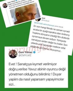 Yılmaz’ın bu paylaşımına bir takipçisi, “En son hangi filmde ne zaman oynadı acaba bir ayağı toprakta olan Anthony Hopkins dünyanın izlediği film dizilerde oynamaya devam ediyor. Türkiye’de sanatçıya verilen değer bu kadar. Son yıllarda usta sanatçıları sadece vefat ettiğinde görüyoruz, duyuyoruz..” sözleriyle cevap verdi.