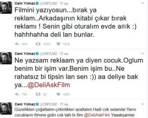 Takipçilerinin “reklam yapıyorsun” eleştirileri üzerine küplere binen Cem Yılmaz, “Filmini yazıyosun…bırak ya reklam..Arkadaşının kitabi çıkar bırak reklamı ! Senin gibi oturalım evde a… 🙂 hahhhahha deli lan bunlar” mesajı paylaştı.