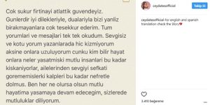 “Çok şükür fırtınayı atlattık güvendeyiz. Günlerdir iyi dilekleriyle, dualarıyla bizi yalnız bırakmayanlara çok teşekkür ederim. Tüm yorumları ve mesajları tek tek okudum. Sevgisiz ve kötü yorum yazanlara da hiç kızmıyorum. Aksine onlara üzülüyoruz çünkü kim bilir hayat onlara neler yaşatmış ki mutlu insanları bu kadar kıskanıyorlar, ailelerinden sevgiyi şefkati görememişler ki kalpleri bu kadar nefretle dolmuş. Ben her ne olursa olsun mutlu hayatımı yaşamaya devam edeceğim, sizlere de mutluluklar diliyorum.”