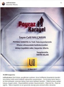 Poyraz Karayel dizisinde Zülfikar rolünde izlediğimiz Celil Nalçakan, veda mesajını dün akşam paylaşmayı uygun gördü.