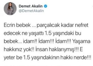 Ecrin bebeğin ölüm haberinden sonra, pop sanatçısı Demet Akalın, sosyal medya hesabından tepkilerini dile getirdi. Akalın, bu tarz olaylara artık idam getirilmesi gerektiğini belirtti.