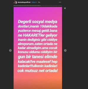 “Kızı elinde kukla yapmışsın, soyup soyup yayınlıyorsun” yazan bir takipçisinin sözlerine çok sinirlenen Akkaya, mesajı “Sapık ruhlu kadınlar… Bize dil uzatmanız bitti sıra çoluğa çocuğa geldi. Yaz günü mayo giymiş bir kız çocuğuna yaptığı yoruma bak! Sizin gibiler yüzünden ülkede adamlar sokakta kadınları gözleri ile taciz etmeyi kendinde hak sayar oldu” şeklinde yanıtladı.