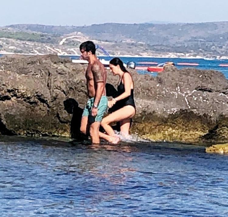 Geçen haftadan beri Çeşme’de tatil yapan sevgililer, birlikte yüzdükten sonra birbirlerine destek olarak, el ele tutuşarak denizden çıktı.