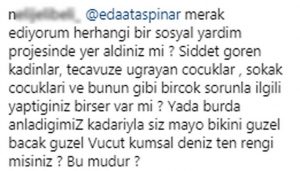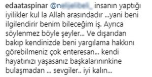 Takipçisinin sert yorumuna Eda Taşpınar’dan yanıt gecikmedi. Sosyetik güzel “insanın yaptığı iyilikler kulla Allah arasındadır … Yani beni ilgilendirir, benim bileceğim iş. Ayrıca söylenmez böyle şeyler… Ve dışarıdan bakıp kendinizde beni yargılama hakkını görebilmeniz çok enteresan… Kendi hayatınızı yaşasanız başkalarınınkine bulaşmadan … Sevgiler.. iyi kalın…” sözleriyle tepkisini dile getirdi.