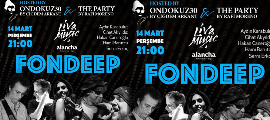 Yaptığı farklı konsept partiler ile her geçen gün yoğun katılımlı ve bol eğlenceli organizasyonlar hayata geçiren Ondokuz30 by Çiğdem Arkant ve The Party by Rafi Moreno, İstanbul’un en prestijli mekanı Alancha’da 14 Mart Perşembe günü büyük bir partiye imza atmaya hazırlanıyor. Gecenin sürprizi ise canlı müzikleri ve kadrosu ile merakla beklenen Fondeep grubu.