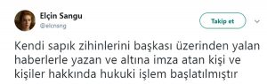 Elçin Sangu, söz konusu haberi sosyal medya üzerinden yaptığı açıklama ile yalanladı. 32 yaşındaki yıldız, “Kendi sapık zihinlerini başkası üzerinden yalan haberlerle yazan ve altına imza atan kişi ve kişiler hakkında hukuki işlem başlatılmıştır” tweetini attı.