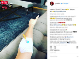 Emina Sandal, sosyal medya hesabından kolunda serumla bir fotoğrafını yayınladı.