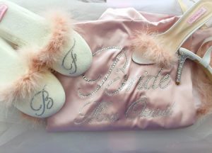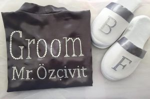 Ünlü çift için üzerinde isimlerinin yer aldığı gelin-damat sabahlığı ve Evcen’e özel nostajik gelin terliği ve ayakkabısı hazırlandı. Evcen’in nedimelerine jest yapmak istemesinin üzerine gelinin yakın dostları için de nedime sabahlığı ve terliği hazırladı.
