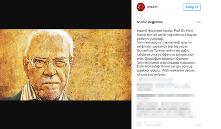 Evcen, yaşamını yitiren İnalcık'ın fotoğrafına, "Hocaların hocası, Prof. Dr. Halil Inalcık tam bir asırlık yaşantısında hayata gözlerini yummuş. Tarih literatürüne kazandırdığı bilgi ve çalışmalar sayesinde bizi biz yapan Osmanlı ve Türkiye tarihini en doğru haliyle okuma ve öğrenme şansını elde ettik. Okuduğum bölümün, Osmanlı Tarihi'nin temel taşlarındandı makaleleri. Bizlere bıraktığı ilim mirası için sonsuz teşekkür ederiz.. Allah mekanını cennet, ruhunu şad eylesin" diye yazdı.