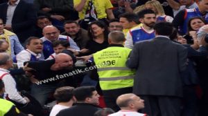 Korku dolu anlar! Yasemin Özilhan ve İzzet Özilhan çifti, Anadolu Efes – CSKA Moskova maçında saldırıya uğradı.