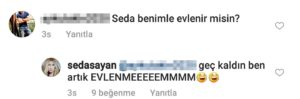 Sunucu ve şarkıcı Seda Sayan sosyal medya hesabı üzerinden kendisine yöneltilen evlilik teklifine ilginç bir yanıt verdi.Şarkıcı Seda Sayan geride bıraktığımız günlerde şarkıcı Cefi Tayuk’la birlikte ‘Seviyorum’ adlı bir proje için bir araya gelmiş, onlar hakkında verdikleri samimi pozlar yüzünden evlendikleri yönünde haberler yapılmıştı. Ancak Seda Sayan haklarında çıkan bu haberleri yayınladığı bir basın bülteni üzerinden sert bir dille yalanlamıştı. Sayan, evlilik konusunu aklından tamamen çıkarttığını göstermek adına bir takipçisinin kendisine yaptığı evlilik teklifine yorum yaparak gösterdi. Seda Sayan kendisine gelen evlilik teklifine ‘Geç kaldın ben artık evlenmem’ yanıtını verdi.