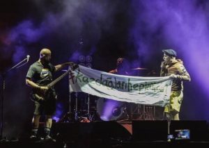 Snob Magazin’in haberine göre; Balıkesir’de düzenlenen Zeytinli Rock Festivali’nde sahneye çıkan Athena, “Kaz Dağları hepimiz için” yazılı bir pankart açtı.