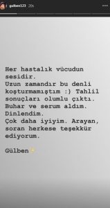 Kısa önce ‘İnfilak’ adını verdiği single’ını çıkaran Gülben Ergen, yoğun temponun altından kalkamadı ve hasta düştü. Ergen, sosyal medya hesabından, “Her hastalık vücudun sesidir. Uzun zamandır bu denli koşturmamıştım. Tahlil sonuçları olumlu çıktı. Buhar ve serum aldım. Dinlendim. Çok daha iyiyim. Arayan, soran herkese teşekkür ediyorum.” açıklamasını yaptı.