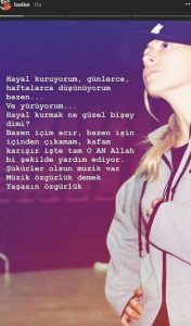 “Hayal kuruyorum, günlerce, haftalarca düşünüyorum bazen… Ve yürüyorum… Hayal kurmak ne güzel bir şey değil mi? Bazen içim acır, bazen işin içinden çıkamam, kafam karışır işte tam o an Allah bir şekilde yardım ediyor. Şükürler olsun müzik var, müzik özgürlük demek, yaşasın özgürlük.”