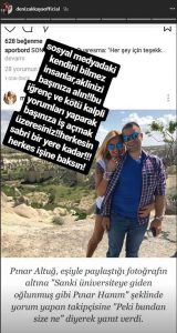 Eşi Yağmur Atacan’la arasındaki yaş farkı yüzünden sürekli olarak haber olan ve takipçilerinden aldığı sorumsuz ve olumsuz yorumlar yüzünden zaman zaman onlara sert tepkiler de verebilen Pınar Altuğ’a bir destek de Deniz Akkaya’dan geldi. Akkaya, Pınar Altuğ’un eşini üniversite öğrencisine benzeten son yorumla ilgili haberi de paylaşarak üzerine; “Sosyal medyadaki kendini bilmez insanlar, aklınızı başınıza alın! Bu iğrenç ve kötü kalpli başınıza iş açmak üzeresiniz! Herkesin sabrı bir yere kadar! Herkes işine baksın” şeklinde bir not düşerek yapılan bu saygısızlığa tepki gösterdi.