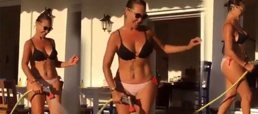 Avşar, Ayvalık’taki yazlığının bahçesinde bikinili halde müzik eşliğinde çiçekleri suladı.