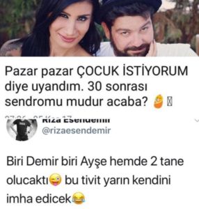 İrem Derici sosyal medya hesabına “Pazar pazar çocuk istiyorum diye uyandım. 30 sonrası sendromu mudur acaba?” diye yazdı. Rıza Esendemir eski eşinin bu sözlerine “Biri Demir biri Ayşe hem de iki tane olacaktı. Bu tweet yarın kendini imha edecek” diye karşılık verdi.