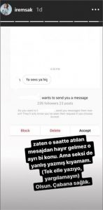 Oyuncu İrem Sak, Instagram’dan gelen taciz mesajını ifşa etti.