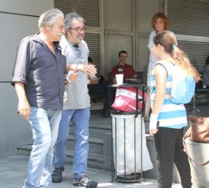 Alana girişte sanatçı dostu Selçuk Yöntem’le karşılaşan ve ayaküstü sohbet eden usta oyuncu, muhabirleri görünce elini kızının omzuna atarak poz verdi.