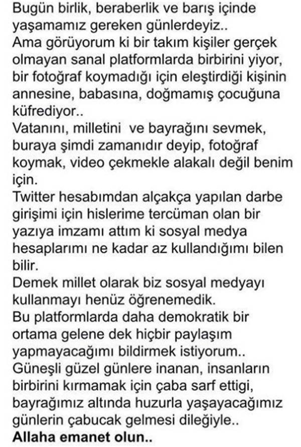 Hakkında yapılan eleştirilere cevap veren yakışıklı oyuncu, "Sosyal medya platformlarında daha demokratik bir ortama gelene dek hiç bir paylaşım yapmayacağımı bildirmek istiyorum. Güneşli güzel günlere inanan, insanların birbirini kırmamak için çaba sarf ettiği, bayrağımız altında huzurla yaşayacağımız günlerin çabucak gelmesi dileğiyle. Allah'a emanet olun" ifadelerini kullandı.