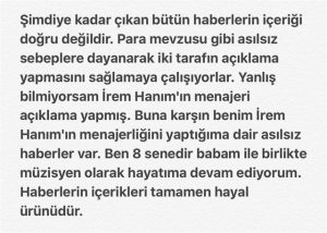 “Şimdiye kadar çıkan bütün haberlerin içeriği doğru değildir. Para vemzusu gibi asılsız sebeplere dayanarak iki tarafın açıklama yapmasını sağlamaya çalışıyorlar. Yanlış bilmiyorsam İrem Hanım’ın menajeri açıkla yapmış Buna karşın benim İrem Hanım’ın menajerliğini yaptığıma dair asılsız haberler var. Ben 8 snedir babam ile birlikte müziyen olarak hayatıma devam ediyorum. Haberlerin içerikleri tamamen hayal ürünüdür.”