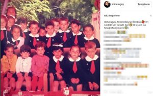 Sonrasında Paramparça dizisinin kadrosuna katılan Mine Tugay sadece oyunculuğuyla değil güzelliğiyle de göz dolduruyor. 38 yaşındaki oyuncu sosyal medya hesabından yaptığı paylaşımlarla neşeli kişiliğini ortaya koymaktan geri durmuyor. Tugay’ın son paylaşımı takipçilerini yıllar öncesine götürdü. İlkokul yıllarında çekilmiş bir kareyi hesabından paylaşan güzel oyuncu fotoğrafa yazdığı: Ankara/Bayrak İlkokulu… En soldaki sarı ceketli ben (ilk aşkım da fotoğrafın içinde) notuyla dikkat çekti. Ancak Mine Tugay o çocuğun kim olduğunu belirtmekten kaçındı.