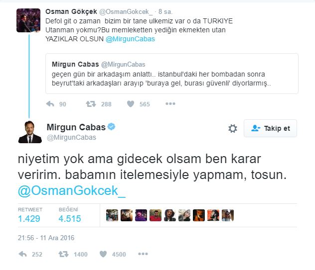 Sosyal medyada gazeteci Mirgün Cabas’la Melih Gökçek’in oğlu Osman Gökçek birbirine girdi. İstanbul’da yaşanan hain saldırı sonrası Mirgün Cabas’ın attığı “geçen gün bir arkadaşım anlattı.. istanbul’daki her bombadan sonra beyrut’taki arkadaşları arayıp ‘buraya gel, burası güvenli’ diyorlarmış..” tweetiyle İstanbul’daki güvenlik açığına dikkat çekti.  Osman Gökçek, Mirgün Cabas’a cevaben “Defol git o zaman bizim bir tane ulkemiz var o da TURKIYE Utanman yokmu? Bu memleketten yediğin ekmekten utan YAZIKLAR OLSUN @MirgunCabas” diyerek cevap verdi.