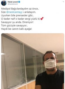 Twitter’dan açıklama yapan Haluk Levent, Neslican Tay ile ilgili olarak “Medipol Bağcılar’daydım az önce. Size Neslican Tay’ı anlatayım. Uyurken bile prensesler gibi… O kadar naif o kadar sevgi yüzlü ki. Savaşıyor şu anda. Direniyor, tüm gücüyle savaşıyor. Haydi be canım kalk ayağa” diyerek açıklama yaptı.