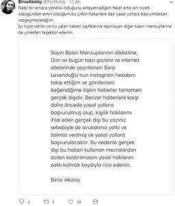 Birce Akalay, geçtiğimiz yıl boşandığı eşi Sarp Levendoğlu’nun Instagram’da takip ettiği ve yaptığı paylaşımı beğendiği yönünde çıkan haberlere ateş püskürdü.