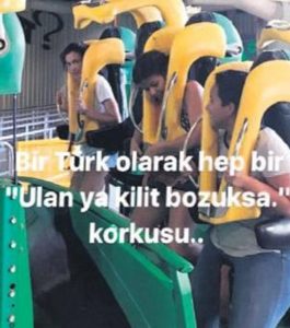 Hız trenine binen Aksoy, sosyal medya hesabından, yaşadığı korkuyu “Bir Türk olarak ‘ya kilit bozuksa’ korkusu” notuyla paylaştı. Metrelerce yükseğe çıkan Aksoy, sonunda da yükseklik korkusunu yendi. (Takvim)