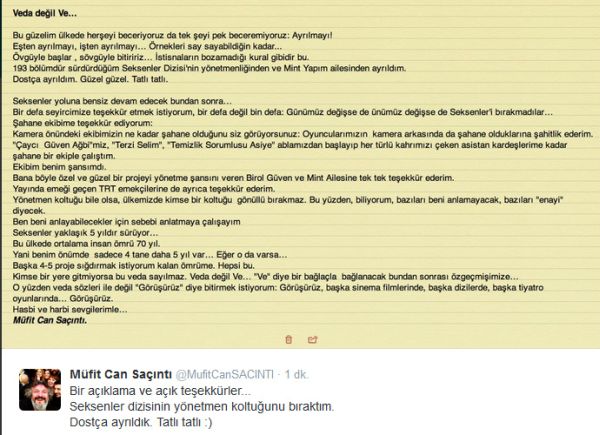Seksenler dizisinin başından beri yönetmen koltuğunda oturan Müfit Can Saçıntı dizinin yönetmen koltuğunu bıraktığını söyledi. Sosyal medya hesabından yazdığı bir notla bu ayrılığı duyuran Müfit Can Saçıntı, yanlış anlaşılmaların ve dedikoduların önüne geçmek adına da büyük bir dikkat göstermiş.