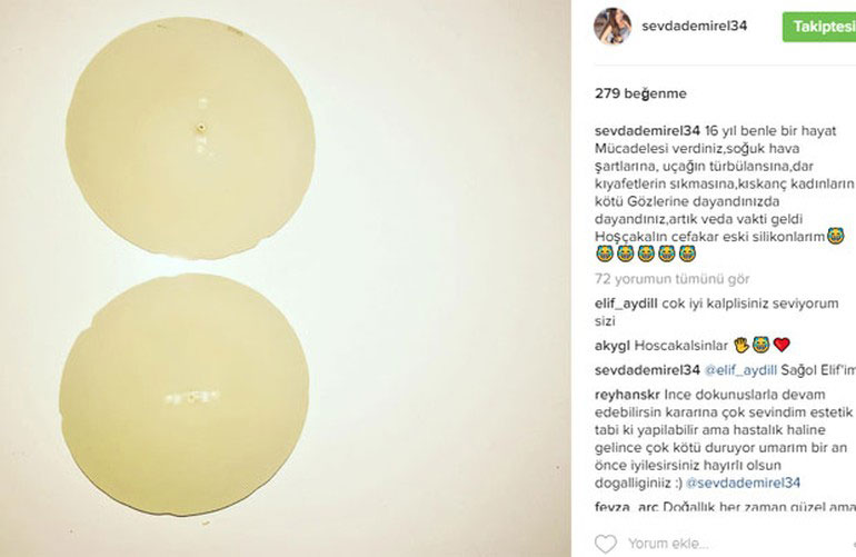 “16 yıl benle bir hayat mücadelesi verdiniz. Soğuk hava şartlarına, uçağın türbülansına, dar kıyafetlerin sıkmasına, kıskanç kadınların kötü gözlerine dayandınız da dayandınız. Artık veda vakti geldi. Hoşçakalın cefakar eski silikonlarım”