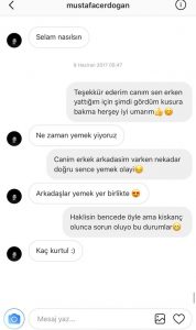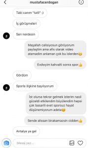 Mesajlarda Erdoğan, Hatice’yi sık sık yemeğe davet ediyor. Hatice “Kıskanç bir sevgilim var” diye teklifi geri çevirince de “Kaç kurtul… Vurmadın mı:)” diye karşılık veriyor. Erdoğan, kendisine çok güvenmeyen şarkıcıyı “Bana güven” diye telkin ediyor.