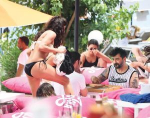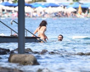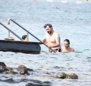 Bodrum’da bir plajda Keremcem’le tavla oynayan Celil Nalçakan, ardından pilates eğitmeni sevgilisi Ceren Kahyaoğlu ile denize girdi.